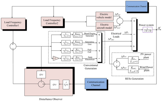 Figure 2 shows the complete dynamical model and mathematical representation. A model of the analyzed islanded AMG is designed to examine and evaluate the proposed system DOBC with the FOC-based LFC scheme. The proposed model is based on cascaded first-order transfer functions (TFs), as presented in the literature [30]. Moreover, the installed RESs are also modeled with the stochastic property of generated power from PV panels for the included wind turbine and PV generators. Also, the microgrid has a conventional DEG unit and a thermal power generation unit. The lithium-ion batteries used in the installed EAC and EVs are designed to participate actively in FR functionality. The proposed case study uses FC and AE units to consider future green hydrogen. Installed FCs can provide clean, sustainable power owing to their superior efficiency and minimal emissions. Simultaneously, the AE offers a robust hydrogen storage and generation solution, enhancing renewable energy integration and reducing reliance on fossil fuels [48].