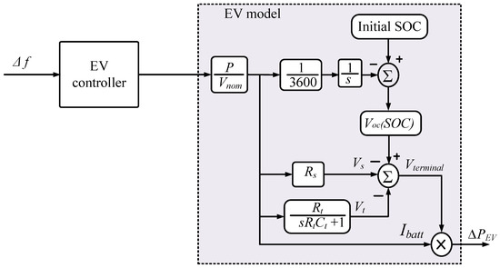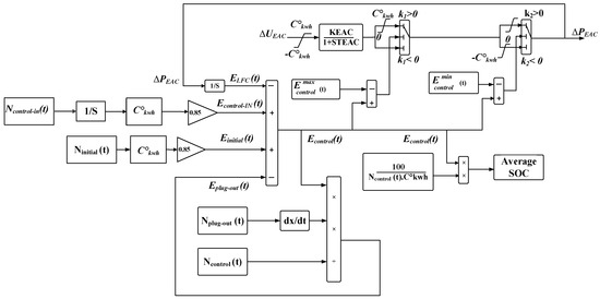 During the 1 h charging period, the EAC is not controllable and cannot respond to LFC signals. The EACs are charged up to 80% SOC, allowing them to have sufficient charge for entering the controllable mode and responding to LFC signals. The central load dispatch center coordinates with local control centers, which oversee groups of EACs and transmit LFC signals every second. The EAC updates its SOC to the local control center every 30 s. Given the model developed in Figure 3, the proposed controller output for the EAC is denoted as , while represents the power output during the charging and discharging processes of EAC.