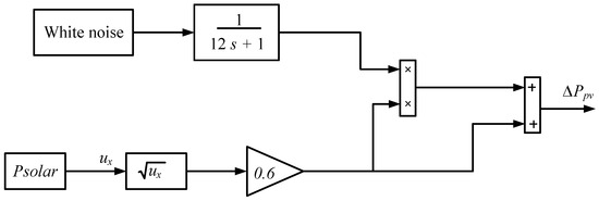 The configuration model of a realistic PV solar generation system is implemented based on the model presented in Figure 5 [60]. White noise is used to model the variations in the generated PV power.