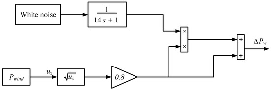In this equation, represents the air density in kg/m3, is the swept area of the turbine blades in square meters, denotes the power coefficient, and is the wind speed in meters per second. The power coefficient reflects the turbine’s efficiency in converting wind power into mechanical work. A realistic wind turbine generation system model, which accounts for these factors, can be implemented as shown in Figure 6 based on the model described in [60].