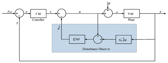 The DOBC architecture uses an inverse plant model and a low-pass filter to estimate and reject disturbances affecting the system. The main structure and components of DOBC are shown in Figure 7. The filter ensures that high-frequency noise is filtered out while maintaining the system’s output unaffected by disturbances. In the absence of disturbances, the dynamics of the system are shown in Equation (11):