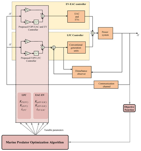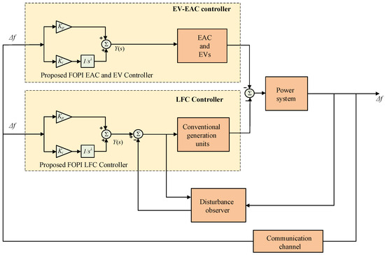 This work proposes a refined hybrid FR controller leveraging the synergistic combination of DOBC and the fractional-order control method. The new controller utilizes three main parts: the DOBC, the FOC LFC, and the FOC method of EAC and EVs. The position of each part in the designed control architecture is shown in Figure 2. The joint operation of the three parts has to preserve the control of frequency deviations at their minimum value, with the minimum overshoot/undershoot at sudden step load changes and the fastest response to recover the system. So, the proposed controller guarantees equilibrium between generated and consumed power by adjusting the output power of each controlled source/storage element.