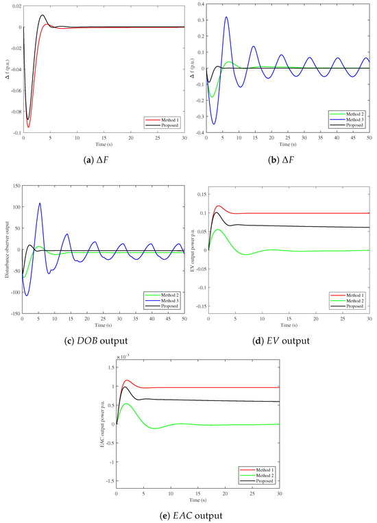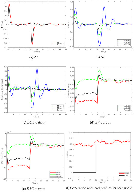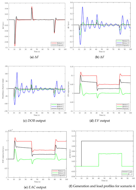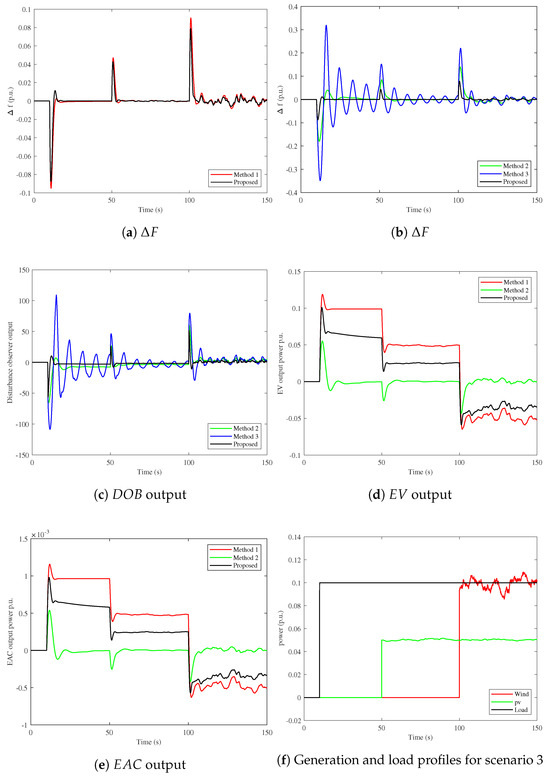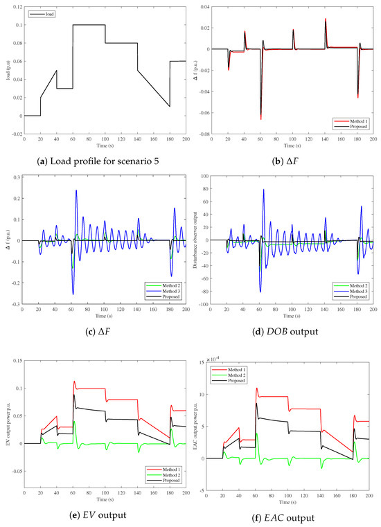 Figure 14a displays the load profile for Scenario 5, where the load fluctuates in a step-like pattern, indicating changes in load over a period of 200 s for a limit between 0 and 0.1 p.u. These fluctuations are likely used to analyze the system’s response to varying load conditions in LFC and to evaluate the performance of the proposed hybrid DOBC/FOC controller and its robustness for the LFC loop, in addition to the operation of EVs and EAC. Figure 14b shows the influence of the observer on the performance of the proposed controller. Hence, it can be seen that the output is better in the case of observer presence than without. Furthermore, it can be fulfilled that the DOBC/FOC controller has the best execution in controlling every step and ramp load changes and frequency deviations with faster convergence than methods 1, 2, and 3 as depicted in Figure 14c,d. Furthermore, the robustness of this controller has been proved for continuous and off-load variations. Moreover, the controlled process of EV and EAC storage devices for regulating the AMG system frequency based on the hybrid DOBC/FOC controller, which is optimized by the MPA technique, is shown in Figure 14e,f. This fast charge/discharge contribution from the EV and EAC indicates the robustness of the proposed coordination of DOBC/FOC LFC, EVs, and EAC in maintaining the dynamic AMG stability. Summarized results of this scenario are shown in Table 9.