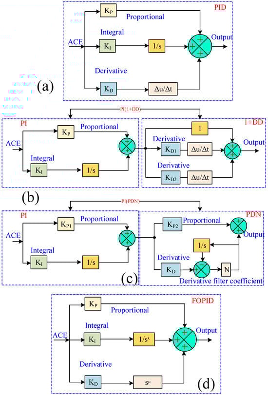 Structure design of (a) PID controller, (b) PI(1+DD) controller and (c) PI(PDN) controller, and (d) FOPID controller.