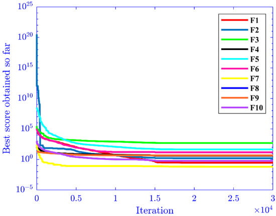 In the fitness matrix, fit1 represents the first fisherman’s fitness value, fit2 represents the second fisherman’s, and so on. The CFA convergence curves for ten common test functions are displayed in Figure 4. During the iterations, the algorithm employs 0.5 to split the fraction of exploration and exploitation. In the process, it is used in the second half of the phase (when EFs/MaxEFs ≥ 0.5) after the global has been studied in the first half (when EFs/MaxEFs < 0.5).