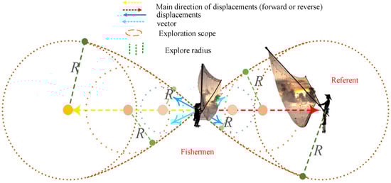 One of these, Exp, has a range of values from (−1, 1) and is the significance of the empirical evaluation that the fisherman derived utilizing any posth (pos = 1 or 2 or… or N, p ≠ i) fishermen as the desire object. Following the Tth full position update, fitmax and fitmin represent the worst and best fitness scores, respectively. T is the number of times that the positions of the fisherman have changed. Following the repetitions of Tth and (T + 1)th, and reflect the location of the ith fishermen in j-dimension. The random number rs is between 0 and 1. Dis represents the Euclidean separation between the referent and the ith person. A random unit vector of dimension d is denoted by s. Calculate the primary direction of movement (this particular person received the favorable instruction from the fishermen) and duration using statistical analysis. R is either lower or equal to Dis. Additionally, the number of evaluations (EFs) and the absolute quantity of Exp affect the exploration domain R that are currently conducted. The fisherman in the middle of Figure 5 is depicted as stretching both in the direction of and away from the reference point. The radius, which forms a stacked circular pattern and a brown exploring range, is defined as the distance between each point and the center. The fisherman in Figure 5 on the left is shown getting ready to move, while the randomly referenced fisherman is seen on the right. The fisherman’s flexibility in motion is indicated by the brown region, where R is the movement radius. The primary movement direction is indicated by the yellow and red arrows, while the independent search drift of the fisherman is depicted by the blue arrow.