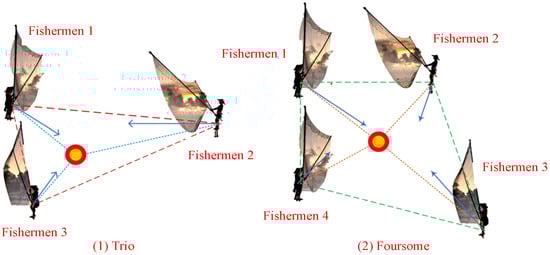 Fishermen work together in groups of three or four to surround possible fish spots for the group capture (p ≥ α), using nets to increase their catch. The environment, team relationships, and health all affect the direction and distance of their movements; as more fish are caught and people congregate, their motions become more accurate. Figure 6 displays the method’s schematic representation. The following is how the model and formula are developed as Equations (27) and (28):