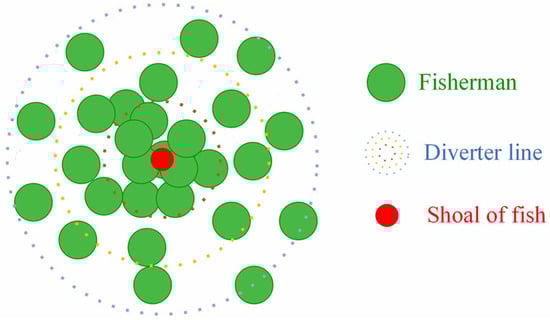 There are fish that escape throughout the fishing procedure, but fishermen work together to drive and surround them. Fishermen are positioned around the fish, with the center focusing on catching the main group and the outer ones targeting escapees. This cooperative strategy improves capture rates. The distribution follows a Gaussian model, as shown in Figure 7, with the updated Equations (29) and (30) below: