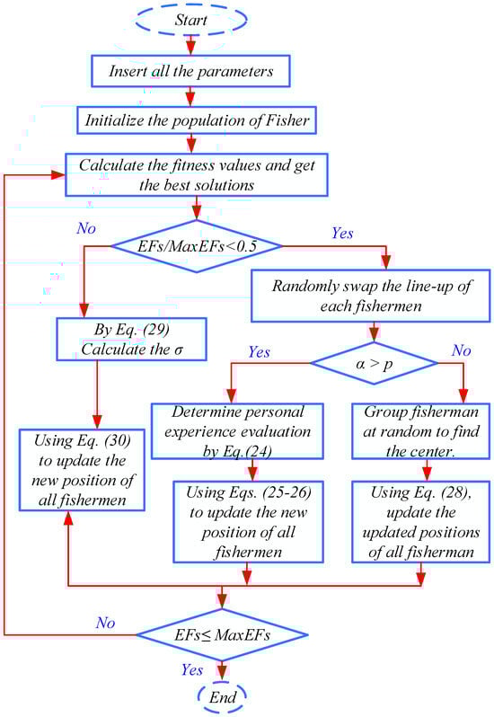 In summary, the CFA is implemented in two phases: the exploration phase, which comprises cooperative fishing and dispersed exploration for advantages, and the exploitation stage, which involves coordinated encirclement efforts to capitalize on collective power []. The metaheuristic technique evaluates the global situation and ultimately decides on the best course of action by using search agents to provide continuous location updates. Equation (20) represents the CFA model, in which every fisherman acts as a search agent:
