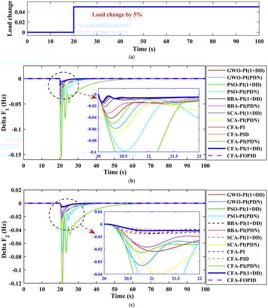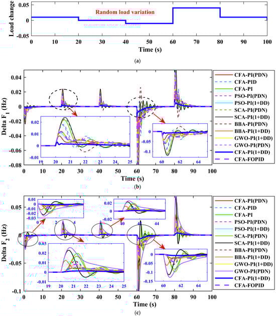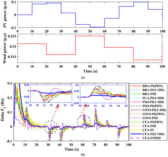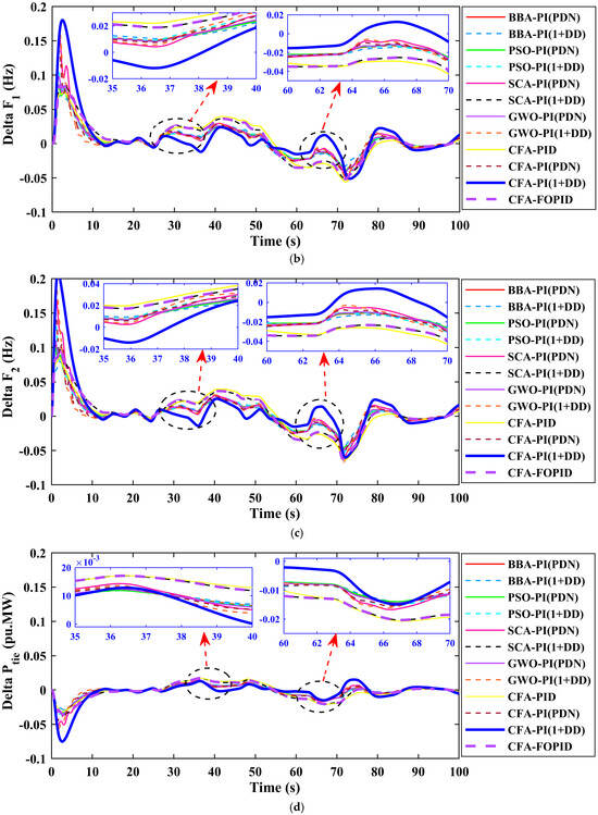 Renewable energy sources (RESs) are increasingly combined into the power system due to market liberalization and environmental and economic benefits, but their weather-dependent variability causes power production and demand mismatches, leading to issues like frequency and regional power transmission fluctuations. To maintain synchronization in power systems, frequency must remain constant; disruptions in the proper balance of production and load might produce frequency variations, risking serious issues. Therefore, a mechanism known as load frequency control (LFC) or automated generation control (AGC) is needed to keep the frequency and tie-line power within predefined stable limits. In this study, advanced proportional–integral–derivative PID controllers such as fractional-order PID (FOPID), cascaded PI(PDN), and PI(1+DD) for LFC in a two-area power system integrated with RES are optimized using the catch fish optimization algorithm (CFA). The controllers’ optimal gains are attained through using the integral absolute error (IAE) and ITAE objective functions. The performance of LFC with CFA-tuned PID, PI, cascaded PI(PDN), and FOPID, PI(1+DD) controllers is compared to other optimization techniques, including sine cosine algorithm (SCA), particle swarm optimization (PSO), brown bear algorithm (BBA), and grey wolf optimization (GWO), in a two-area power system combined with RESs under various conditions. Additionally, by contrasting the performance of the PID, PI, cascaded PI(PDN), and FOPID, PI(1+DD) controllers, the efficiency of the CFA is confirmed. Additionally, a sensitivity analysis that considers simultaneous modifications of the frequency bias coefficient (B) and speed regulation (R) within a range of ±25% validates the efficacy and dependability of the suggested CFA-tuned PI(1+DD). In the complex dynamics of a two-area interconnected power system, the results show how robust the suggested CFA-tuned PI(1+DD) control strategy is and how well it can stabilize variations in load frequency and tie-line power with a noticeably shorter settling time. Finally, the results of the simulation show that CFA performs better than the GWO, BBA, SCA, and PSO strategies.