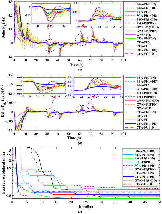 - Comparative Performance Assessment Against State-of-the-Art Algorithms: The proposed CFA-tuned controllers are benchmarked against well-established optimization techniques, including particle swarm optimization (PSO), brown bear algorithm (BBA), sine cosine algorithm (SCA), and grey wolf optimizer (GWO). The results confirm that CFA outperforms these techniques in terms of convergence speed, control accuracy, and system stability, thereby validating its suitability for complex power system applications.