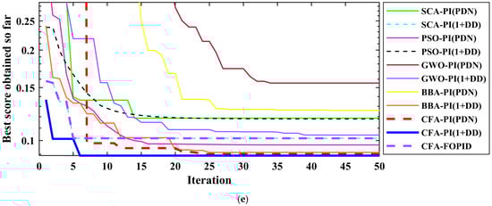 Parallel to the evolution of optimization techniques, significant attention has been paid to improving the structure and functionality of PID controllers themselves. Classical PID controllers have been extended into more sophisticated forms to offer better robustness, disturbance rejection, and adaptability in the presence of renewable energy fluctuations. These include cascade configurations such as the (1+PD)-PID [], PI(1+DD) [], PDF+(I+PI) [], and PD-PIDN [], which are tailored to mitigate overshoots and improve the dynamic response under varying conditions. Furthermore, fractional-order control schemes such as the fractional-order proportional-integral (FOPI) [], fractional-order proportional-derivative (FOPD) [], and fractional-order PID (FOPID) controllers [,] provide an additional degree of freedom in tuning, allowing for the more accurate modeling of real-world system dynamics. Hybrid structures like FOPID+FOPI [], and combinations with tilt integral derivative (TID) controllers [] have also emerged as powerful alternatives to classical control schemes.