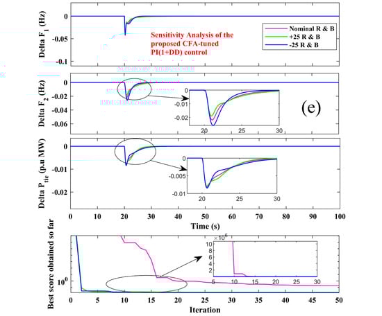 The proposed CFA method utilizes the integral of absolute error (IAE) of frequency deviations in both areas and tie-line power fluctuations as the objective function that will be applied in this work to maximize the controller gains. Consequently, Equation (13) provides the IAE objective function.