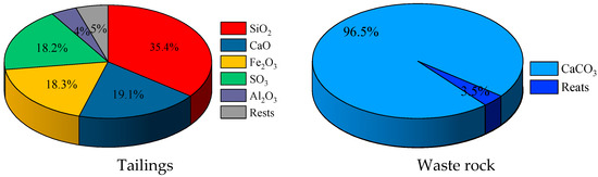 During mixing, chemical reactions may occur between the aggregate and the cementitious material, influencing the physical and mechanical properties of the backfill. Thus, it is essential to understand the chemical composition of the aggregates. X-ray fluorescence spectroscopy (XRF) was employed to analyze the major chemical components of the tailings and waste rock. As shown in Figure 1, the primary constituents of the tailings include , , , , and ; the cement mainly comprises , , , , and , while the waste rock is predominantly composed of . To improve backfill performance by minimizing interparticle voids, the waste rock was ground to a finer size.