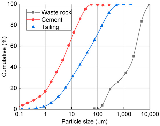 The laser particle sizing instrument (Malvern Mastersizer 2000, Malvern Instruments Limited, Malvern, UK) was used to analyze the particle size distribution of tailings and cement. The sieve analysis was conducted for the waste rock as its size larger than 74 . The particle size distribution curves of the three materials are presented in Figure 2. The particle size of the waste rock was measured to be less than 10 mm. The specific gravity of the raw materials was measured in accordance with GB/T 50123-2019. For particles smaller than 5 mm, the pycnometer method was adopted. The test results indicate that the specific gravities of tailings, waste rock powder, and cement are 2.74, 2.68, and 3.12, respectively.