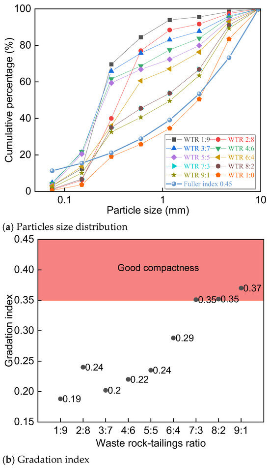 Cumulative percentage and respective gradation index of CTRB with different waste rock-to-tailings ratios. (a) Particles size distribution and (b) Gradation index.
