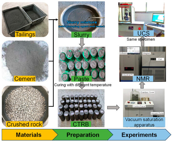 After the backfill reached the curing age (28 days), NMR and compressive strength tests were conducted for mechanical properties and pore structure under different curing temperatures. The whole test procedure is illustrated in Figure 4.