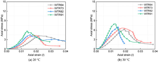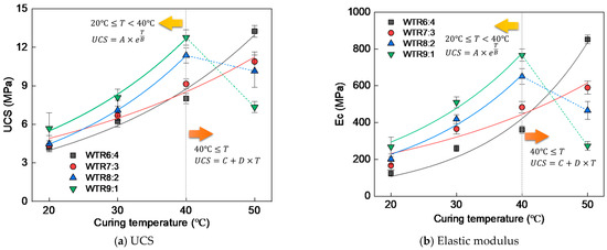 As shown in Figure 6, the UCS and of the backfill exhibits different temperature-dependent behaviors under different aggregate ratios: (1) For WTR = 6:4 and 7:3, the UCS and increases exponentially with temperature over the 20–50 °C; (2) For ratios of 8:2 and 9:1, strength increases exponentially from 20 °C to 40 °C but shifts to a linear trend or even decline from 40 °C to 50 °C.
