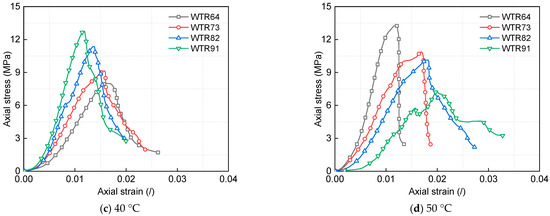 Stress strain relations of CTRB with different WTR and curing temperature. (a) 20 °C, (b) 30 °C, (c) 40 °C and (d) 50 °C.