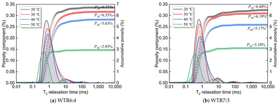 When the WTR is 6:4 or 7:3, the main peak intensity decreases continuously as the curing temperature increases. In this case, the relaxation time of the primary peak shifts to longer times from 20 °C to 40 °C, indicating pore enlargement or enhanced connectivity. However, at 50 °C, the relaxation time shifts sharply to shorter times, suggesting thermal shrinkage, dehydration, or structural degradation of the pore network.