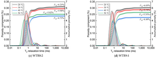 In case of WTR increasing to 8:2 or 9:1, the response is nonlinear. The main peak intensity initially decreases then increases with curing temperature, with 40 °C serving as a transition point. For instance, at 8:2 and 50 °C, the relaxation time at the primary peak shifts forward, and cumulative porosity increases to a level between those observed at 20 °C and 30 °C, leaning closer to 20 °C. In contrast, at 9:1 and 50 °C, the relaxation time shows minimal forward shift, but the cumulative porosity still increases, approaching that at 30 °C.
