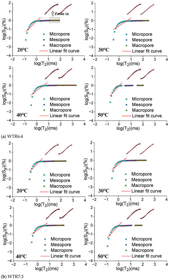 which indicates that if the pore structure of specimen exhibits fractal characteristics, a linear correlation should exist between and in the NMR spectrum. This relationship can be verified using graphical methods or regression analysis. If such a linear correlation is confirmed, the fractal dimension and the maximum relaxation time of the pore structure can be determined from the coefficients of the regression equation. Furthermore, the correlation coefficient obtained from the regression analysis reflects the degree to which the pore structure conforms to a fractal model. The NMR-derived fractal dimension can be used to characterize the complexity of the pore structure [39,40,41].