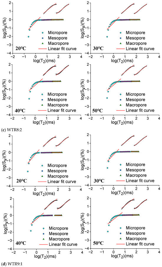 To quantitatively describe the geometric complexity of the pore structure across different scales, fractal theory was applied to analyze the NMR relaxation spectrum. The cumulative pore volume distribution in log–log coordinates was used to derive the fractal dimension , based on the power–law relationship in Equation (10).