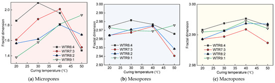 Across all temperature conditions, consistently decreased as the proportion of WTR increased from 60% to 90%. For instance, at 30 °C curing, the of WTR64 is 2.09, while for WTR91 is 1.58. This trend suggests that higher coarse aggregate content reduces the volume fraction of fine particles, thereby limiting gel formation and micropore connectivity. The fine matrix phase is critical in forming a well-interconnected micropore network, and its reduction leads to simpler, less space-filling structures, as reflected in the lower fractal dimension.
