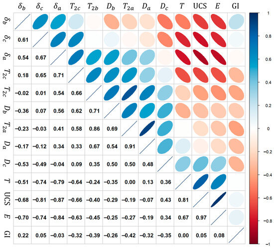 In general, most Pearson correlation coefficients between pore structure parameters, fractal dimensions, curing temperature, and mechanical properties fall within the range of moderate correlation (|r| = 0.4–0.7). Prior to the analysis, the correlation trends among these variables were not known. This exploratory statistical approach helped identify the key factors influencing the mechanical performance. In particular, parameters such as , , , and exhibit relatively strong correlations ( > 0.7) with both UCS and E, suggesting that pore size distribution and relaxation characteristics play a crucial role in strength development under thermal curing conditions. These findings highlight the necessity of multi-variable coupling analysis to better understand the microstructure–mechanical property relationships in cemented backfill materials.