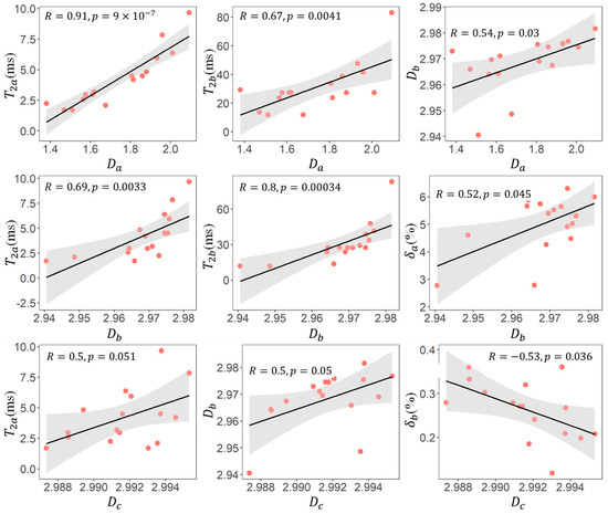 Figure 11 shows the correlation plots between fractal dimensions and other pore structure parameters. Each subplot includes Pearson correlation coefficient () and p-value. The results reveal strong internal coupling, indicating that fractal complexity is closely linked to pore size and content at multiple scales.
