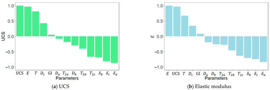 Correlation coefficients between each pore structure-related variable and (a) UCS, and (b) elastic modulus (E).