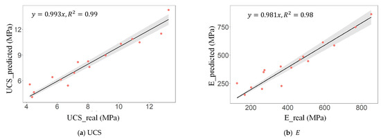 Comparison between predicted and measured values of (a) UCS and (b) E using the developed multivariate regression models.
