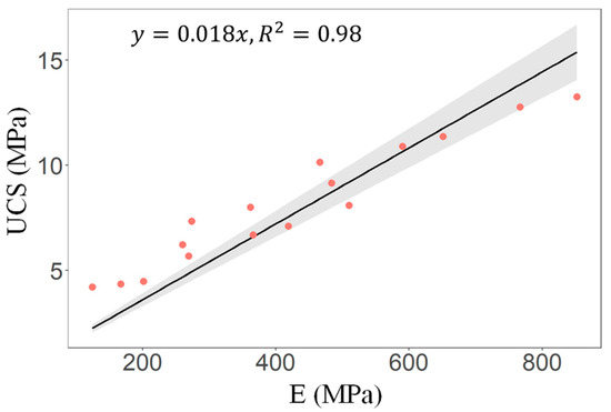Table 2 indicated that the UCS and E share similar structural determinants: lower total porosity, reduced pore size, and increased spatial complexity. Figure 14 shows the correlation between UCS and . UCS and E exhibit an exceptionally strong linear relationship, with a coefficient of determination = 0.98 and a slope of 0.018.