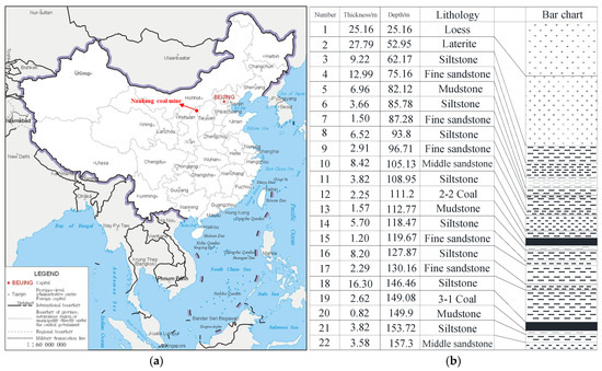 Location diagram of the Nanliang coal mine (a) and a comprehensive histogram of the 30105 working face (b).
