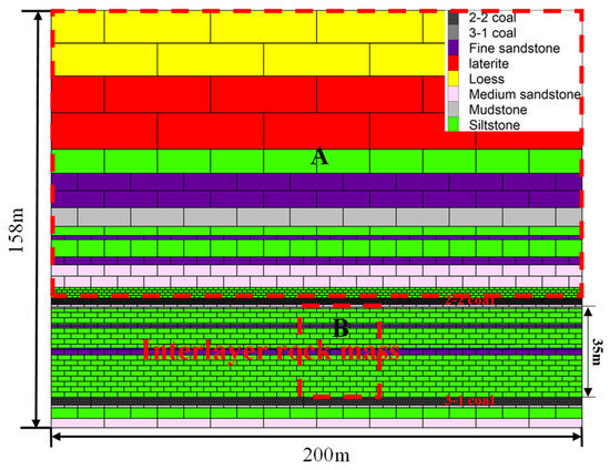 Based on the comprehensive histogram shown in Figure 1 and the mechanical parameters listed in Table 1, a 200 m × 158 m discrete element model of the Nanliang coal mine was constructed, as shown in Figure 2, using the Mohr–Coulomb constitutive model. For the 2-2 coal seam, the interval mining method (for every 50 m of the working face advancement, a 10 m coal pillar was left) was implemented, whereas longwall mining was employed for the 3-1 coal seam (the advance distance of the working face typically reaches hundreds of meters or even several kilometers). The excavated zones in the 2-2 seam were sequentially designated as Goaf 1#, 2#, and 3#, whereas the mined-out region of the 3-1 seam was labeled Goaf 4#, with its active face advancing beneath Goaf 2#. Two critical zones were monitored: the overlying rock mass of the 2-2 coal seam and interlayer rock mass in front of the 3-1 coal seam working face, termed research areas A and B, respectively. By monitoring the damage contact area, the damage coefficients of the overlying rock and interlayer rock mass caused by repeated mining were analyzed.