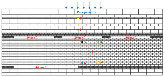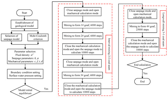Based on the above numerical model of the repeated mining under insufficiently collapsed gob, a fluid–solid coupling model was re-established for the numerical simulation. Due to the mining of a shallow-buried coal seam, the surface subsidence and soil dislocation can lead to large cracks in the loose layer as well as water seepage. Therefore, slightly different from the above model, the seepage model is without the soil layer on the surface and assumes that there is a rainwater accumulation area above the 2# goaf. An initial water pressure of 3.0 MPa was applied to the overlying rock mass of the 2# goaf, and a seepage model of the surrounding rock during repeated mining under the insufficiently collapsed gob was constructed, as shown in Figure 3. As the measurement points, two points were selected in research area A and five points in research area B, to monitor the changes in the pore pressure before and after repeated mining (as shown in Figure 3). Laboratory tests conducted based on the actual situation on site, have found that the fragmented coal and rock mixture with a grading index of 0.8 and a mass ratio of 1:10 between the fragmented coal and rock most closely represents the actual situation of the fragmented coal and rock mass in insufficiently collapsed gobs. This study adopted the stress−pore−water seepage coupling model of the fragmented coal and rock mixture obtained through water seepage experiments on saturated, fragmented coal and rock mass, as expressed in Equation (1), which is the permeability evolution model of the fragmented coal and rock mass before and after repeated mining in insufficiently collapsed gobs. Moreover, the axial stress–gas permeability evolution law of the fractured rock mass (expressed as in Equation (2)) was taken as a reference for the water permeability evolution law of the interlayer fractured rock mass before and after repeated mining [38]. A fluid–structure coupling simulation of the repeated mining process under insufficiently collapsed gob was performed. Figure 4 shows the specific simulation process.