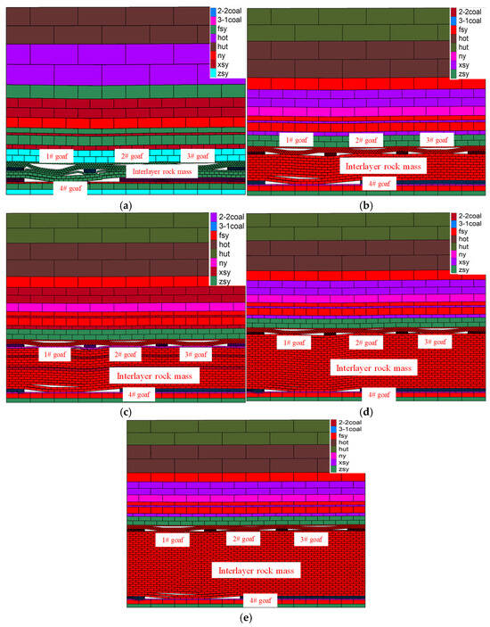 As shown in Figure 1, the interlayer rock mass between the 2-2 and 3-1 coal seams of the Nanliang coal mine is mainly composed of siltstone, fine sandstone, and mudstone. The modeling was simplified by only considering siltstone as the interlayer rock mass during the modeling process; its simulation results were unaffected. Therefore, models with layer spacings of 5, 20, 35, 50, and 65 m were constructed to simulate the effect of layer spacing on the fracture development of surrounding rocks during repeated mining.