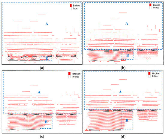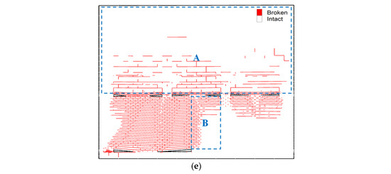 Figure 6 illustrates fracture propagation patterns under different layer spacings following repeated mining. Observations indicate that in research area A, overlying the insufficiently collapsed gob, the total contact length remains unchanged despite an increase in spacing, while research area B exhibits progressive expansion in terms of both spatial extent and total contact length with increasing spacing. To quantify the impact of interlayer distance on fracture evolution, long-term monitoring of the contact failure length was conducted in both zones.