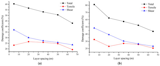 Figure 7 illustrates the impact of layer spacing on fracture propagation within the overburden strata and pre-face interlayer rock mass during repeated mining under insufficiently collapsed gobs. The observations reveal that as the spacing increases, both these regions exhibit a declining damage coefficient, indicating a reduction in both the fracture development intensity and fracture density, and the damage mechanism is dominated by shear. This is consistent with the conclusion presented by Huang et al. [5] in that the overlying rock fractures are mainly composed of shear-tension composite fractures. Notably, at minimal interlayer distances (5 m), shear−tension damage disparities in these zones become apparent. For example, because the goaf in the 2-2 coal seam is insufficiently collapsed gob, that is, the upper rock mass is not fully collapsed, the damage coefficient of the overlying rock mass of the 2-2 coal seam is generally lower than that of the interlayer rock mass. This is consistent with the conclusion drawn by Zhang et al. [6]. Moreover, the reduction extent of the damage coefficient in the overlying rock mass is smaller than that in the interlayer rock mass. This shows that with an increase in the layer spacing, the stress transfer gradually weakens, the stress concentration decreases, and the energy dissipation gradually increases. The residual energy is not sufficient to drive the generation and expansion of new fractures. The disturbance range of repeated mining and the overlap area of the primary mining damage gradually decrease, and the generation of new fractures is suppressed.
