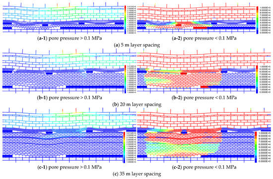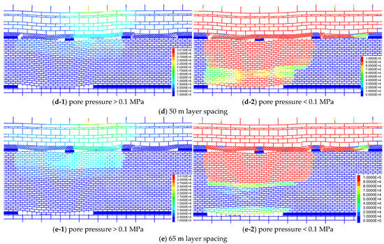 As shown in Figure 9, the pore pressure distribution of the rock formation under different layer spacings is constrained by the color scale range, which is indicated by the boundary of the 0.1 MPa pore pressure. Clearly, with increasing layer spacing, the areas with pore pressure in the interlayer rock mass in front of the working surface in the lower group coal seams gradually decrease, that is, areas with water flowing through gradually decrease. This indicates that an increase in the layer spacing brings about a gradual decrease in both the degree of fracture development as well as the permeability of the interlayer rock body.
