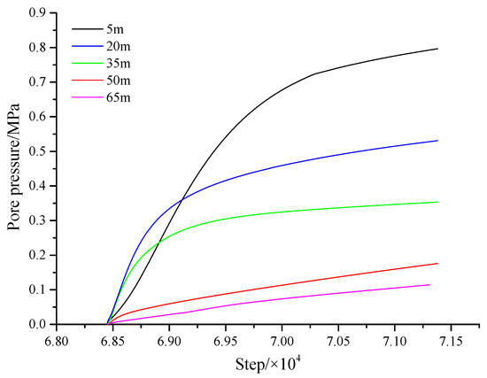 To quantitatively characterize the effect of layer spacing on the seepage characteristics after repeated mining, the pore pressure at measuring point 5, located in the middle of the interlayer rock mass, under different layer spacing conditions was monitored and compared, as shown in Figure 10. The figure shows the pore pressure curves under different layer spacings. With the advancement of the 3-1 coal seam working face, the permeability of the interlayer rock gradually increases, which is consistent with the conclusions drawn by He et al. and Tian et al. [28,29]. With the increase in layer spacing, the pore pressure of the interlayer rock mass gradually decreases, and the rate of decrease becomes smaller.