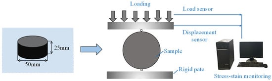 The loading process of the static Brazilian split tensile test is shown schematically in Figure 1.
