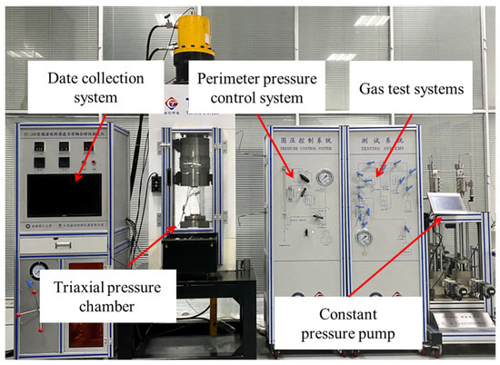 - When the perimeter pressure is kept constant, adjust the gas control system to apply air pressure to the coal sample for permeability measurement. The formula for the permeability of the coal sample according to Darcy’s law is [32] as follows in Equation (1):