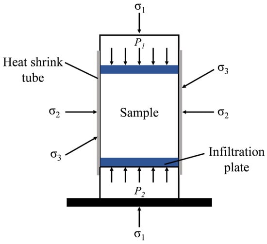 The permeability of coal samples was measured using the steady-state method, and the experimental setup and schematic diagram of coal sample permeation are shown in Figure 2 and Figure 3. The experiments were carried out at a constant temperature (298 ± 0.5 K) and high-purity methane (99.99%) was used as the permeation medium. The perimeter pressure was set at 4 MPa, the inlet pressure at 0.5–3 MPa, and the outlet pressure was kept at atmospheric pressure (0.101 MPa), taking into account that the perimeter pressure should always be at least 1 MPa greater than the inlet pressure to ensure that the permeation environment is airtight. The following are the exact steps of the operation.