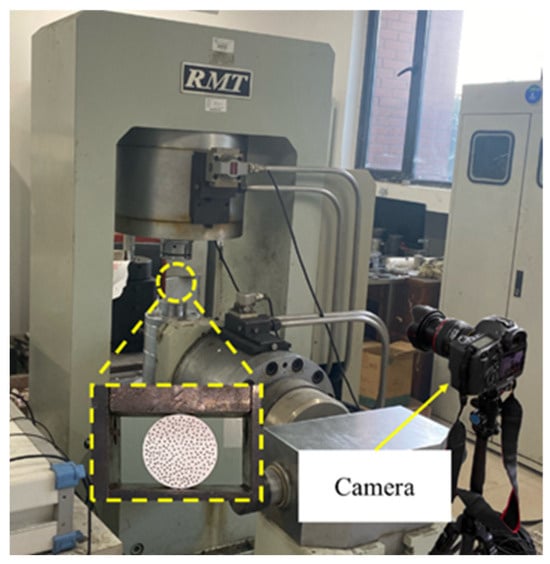 As shown in Figure 4, an RMT rock mechanics testing machine was used for the test. The test device loading plate can automatically adjust the force balance to make the specimen end face uniform pressure, reducing the impact of boundary conditions. Axial displacement control loading with a loading rate of 0.002 mm/s was used for splitting tensile tests. Meanwhile, a camera was used to capture images of the displacement field of the specimen surface during loading. The analysis system adopted DIC-2D processing software (version 2017) to import the captured images into the analysis system for strain calculation, obtain the strain cloud map, and then analyze the crack evolution process of the coal samples [34].