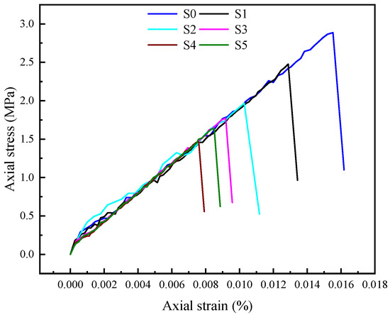 Changes in the mechanical properties of the coal body directly control the whole process of coalbed methane desorption–diffusion–seepage. Therefore, by the means of Brazilian splitting experiments, this study quantitatively analyzes the change rules of mechanical parameters such as the splitting strength, modulus of elasticity, brittleness index, and fracture toughness of coal samples modified by compound acid. The experimental results are shown in Figure 5. The stress–strain curves of each group of coal samples show similar trend changes, and the axial stress suddenly drops to zero after the stress reaches the peak value, which indicates that all groups of coal samples show typical sudden damage characteristics.