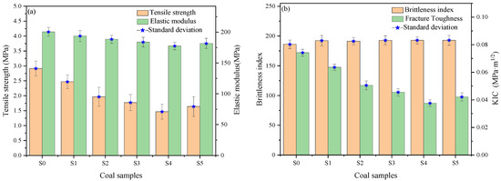 Variation in mechanical parameters of coal samples: (a) split tensile strength and modulus of elasticity and (b) brittleness index and fracture toughness.