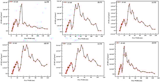 The pore size distribution curve in Figure 8 reflects the relationship of pore volume variation with pore size, where the vertical coordinate dV/dD indicates the amount of pore volume variation (dV) per unit pore size interval (dD). This parameter can quantitatively characterize the degree of contribution of pores to the total pore volume in different pore size intervals. The size of the peak width reflects the number of holes in the corresponding interval, and a wider peak width indicates that the number of holes in the interval is larger and more widely distributed [42]. The narrower the peak width, the more concentrated the pore size distribution and the more uniform the number of holes. In the meantime, the higher the value of the vertical coordinate corresponding to a certain aperture size, the higher the number of holes of that aperture size. The peak then represents the maximum value of the proportion of holes, i.e., the number of holes is most intensive at that aperture size.