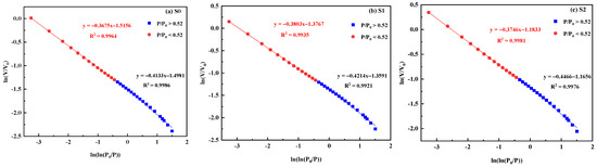 Fractal porosity is a key parameter for characterizing the multiscale structural complexity of coal body pore systems, and the self-similarity of the pore structure is quantitatively characterized by the fractal dimension (D). Based on the FHH (Frenkel–Halsey–Hill) model theoretical system established by Pfeifer, the fractal dimension can be used as an effective index to measure the degree of irregularity of pore geometry. The fractal dimension is calculated as shown in Equations (6) and (7). V represents the equilibrium gas adsorption capacity per unit mass of the sample, measured in cm3/g under a specific equilibrium pressure P. C denotes the y-axis intercept obtained from linear regression analysis of the adsorption isotherm, serving as a dimensionless constant that reflects the adsorption affinity. A is a scaling parameter intrinsically linked to the surface fractal dimension calculation. P0 indicates the saturation vapor pressure of the adsorbate gas at the experimental temperature, while P corresponds to the actual equilibrium pressure during measurement, both expressed in MPa.