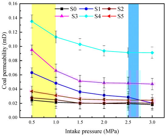 The change in the internal pore structure and change in the mechanical properties of the coal after modification with different ratios of acid solutions also had effects on permeability. As shown in Figure 10, when the perimeter pressure was 4 MPa, the inlet pressure increased from 0.5 MPa to 3 MPa, and the permeability of all groups of coal samples, in general, decreased. At an inlet pressure of 0.5 MPa–1 MPa, the permeability of coal dropped at a rapid speed. The rate of descent of coal permeability was considerably more sluggish when the inlet pressure was above 2.5 MPa. This was caused by the intensification of the swelling effect due to adsorption within the coal as the inlet pressure increased, and the seepage path was squeezed and deformed [43,44,45], resulting in a decrease in permeability [46].
